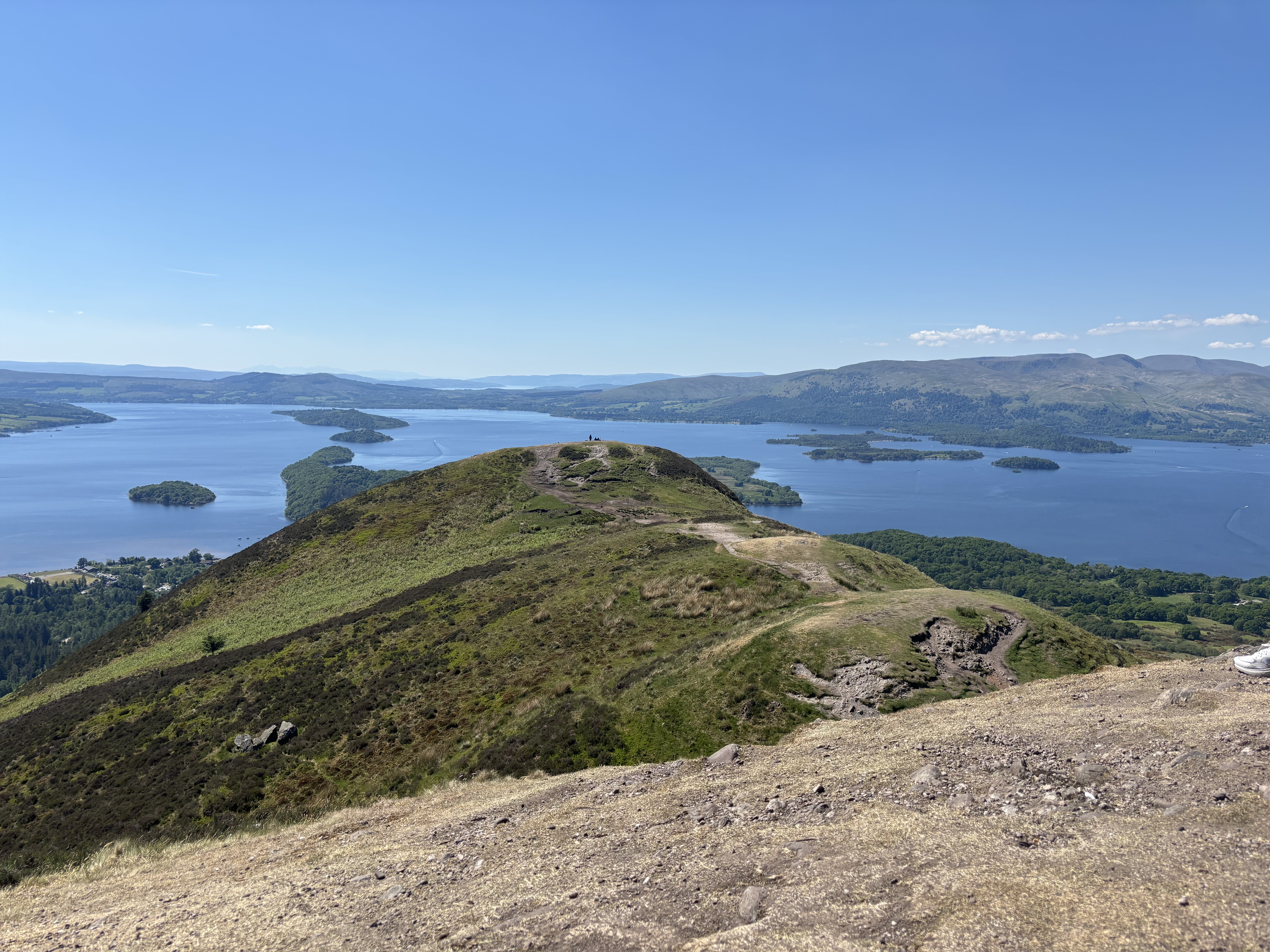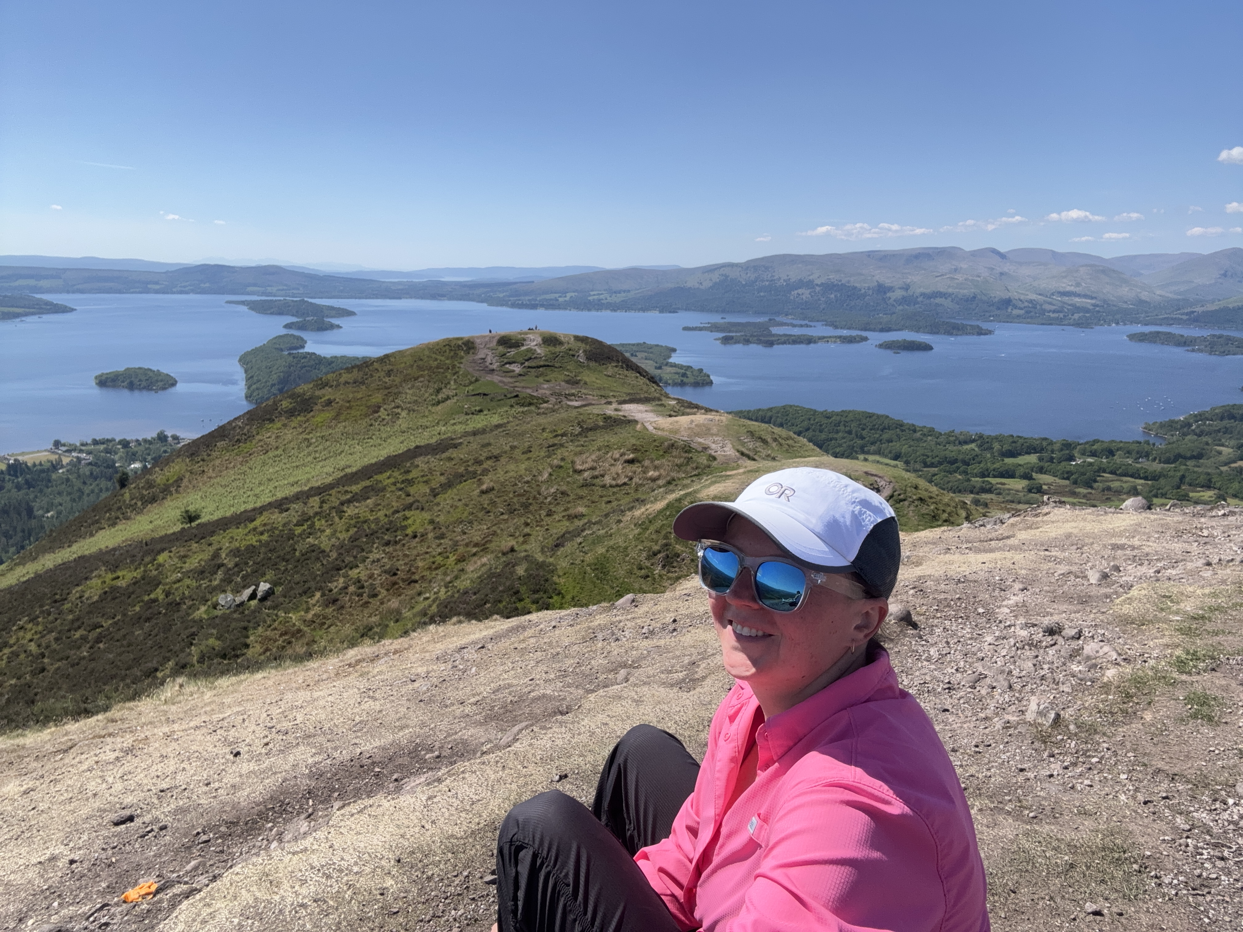 The climb was not that bad. I always find climbing generally easier than going down. It was a steady incline that was manageable. Lots of stairs along the way to help out. And, it was HOT! There was no reprieve from the sun beating down and the heat wave Scotland was experiencing was unprecedented. Don’t get me wrong, I was grateful for the sunshine and gorgeous weather, but some cloud cover would have been nice today. Reaching the top, I chose to truly summit, leaving the WHW for that extra few metres to touch the summit cairn and take a good look around. But, boy was it windy. I didn’t hang out up there too long. The wind cooled me down but the sun was still strong and I wanted to continue on my way. I still had several kilometres to go.