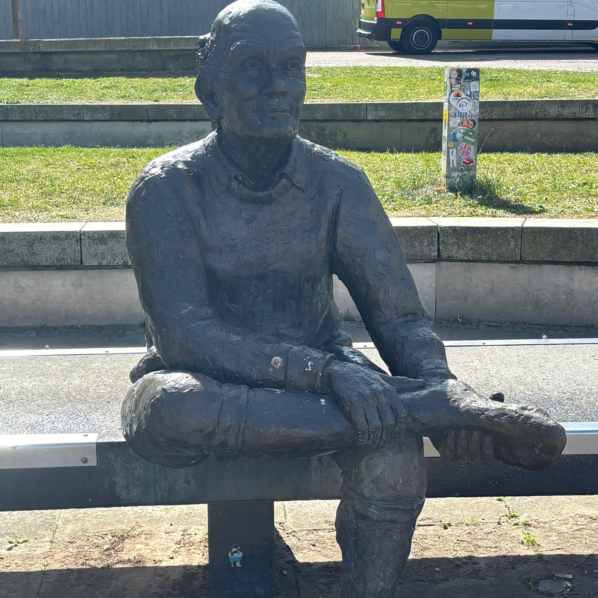 Every spot that opened up between the buildings was a tease where I expected to see the terminus. I was looking for the statue they call “the man with the sore feet”. Finally, at the top of the street, the street opened up and there it was, sitting on the bench inviting me to join. I took in the moment rather than rushing up to “tap off”. A tourist stopped me to ask why all of these people with backpacks are going up and touching this statue. We had a lovely little conversation around the trail and what everyone was doing. I stood there staring at the statue suddenly wishing with every cell of being that I could just touch him and then go back in the opposite direction. Of course, I did not have the time to do that. With a deep breath I strolled up to the statue, said a quiet greeting, and placed my hands on the statue in victory.